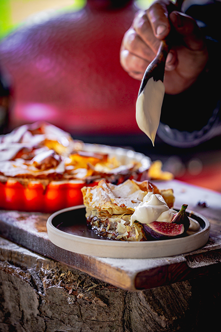 Leg 6 vellen filodeeg klaar, bestrijk elk vel royaal met gesmolten boter (gebruik een Joe Zubehör basting brush, als die subtiel mag worden genoemd). Kreuk de vellen losjes en leg ze speels bovenop de taart, zodat er een knapperige, volumineuze korst ontstaat.