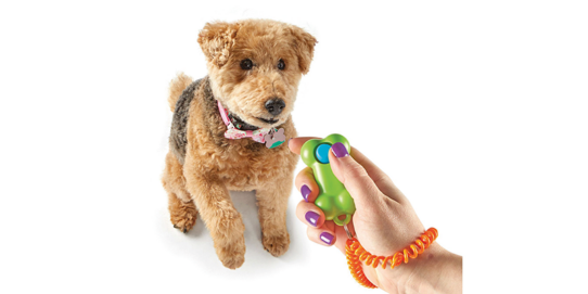 Ideale hulpje bij de opvoeding, gemaakt van duurzaam plastic; de Brightkins Training Clicker in de vorm van een botje, hotdog of puppy en te koop voor € 8,29.