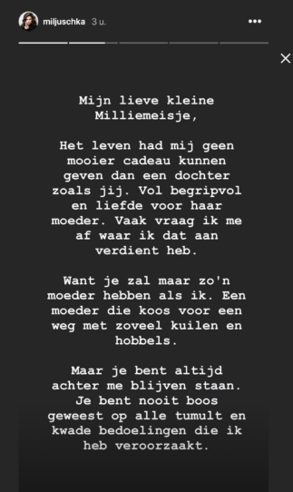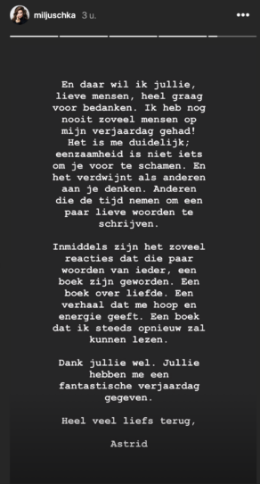 Het is Astrid niet in de koude kleren gaan zitten en daarom heeft ze Miljuschka een lang en persoonlijk bericht gestuurd. Een bericht waarvan je kippenvel krijgt, zo mooi.