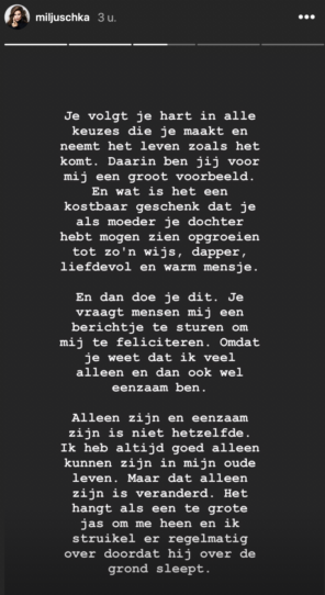 Gisteren plaatste Miljuschka een oproep op haar Instagrampagina om haar moeder te verrassen. Astrid was gisteren jarig en daarom vroeg Miljuschka haar volgers om een lief berichtje voor haar moeder achter te laten. En dat is gelukt! Met maar liefst meer dan 15.000 reacties werd Astrid goed in het zonnetje gezet.