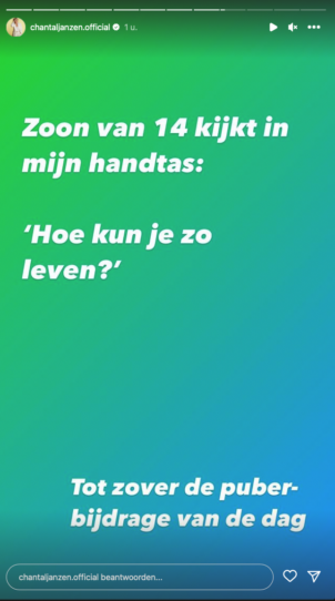 Chantal deelt dagelijks grappige uitspraken van haar kinderen in haar Instagramstory en ook plaatst zij regelmatig foto’s van hen in de gekste outfits. Wij en al haar volgers kunnen hier heel hard om lachen. Dit keer plaatst Chantal een grappig bericht in haar Instagram verhaal. Daar schrijft ze: “Zoon van 14 kijkt in mijn handtas. Hoe kun je zo leven? Tot zover de puberbijdrage van de dag.” Zo te horen wordt Chantal even goed op haar plek gezet.