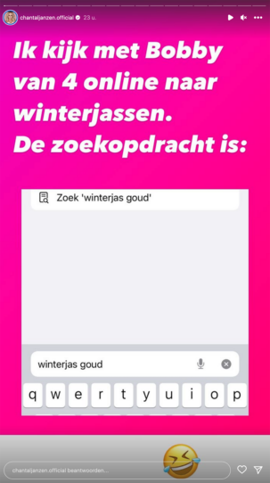 Op Instagram deelt Chantal veel van haar persoonlijke leven. Vaak staan haar kinderen centraal in de hilarische posts, ook deze keer weer. ‘Ik kijk met Bobby van 4 online naar winterjassen. De zoekopdracht is: winterjas goud’, laat Chantal weten.