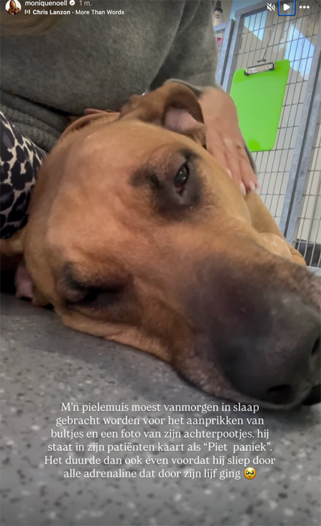 Monique heeft een groot mensenhart, maar ook een heel groot dierenhart. Waar dieren, en in het bijzonder hondjes, geholpen kunnen worden, helpt Monique. Ook is zij zelf een trots hondenbaasje van meerdere viervoeters en helaas deelde zij vandaag zielig nieuws over één van hen. Bij een zielige video van haar hondje schrijft Monique: ‘Mijn zielige pielemuis moest vanmorgen in slaap gebracht worden voor het aanprikken van bultjes en een foto van zijn achterpootjes. Hij staat in zijn patiëntenkaart als “Piet paniek”. Het duurde dan ook even voordat hij sliep door alle adrenaline dat door zijn lijf ging. ‘