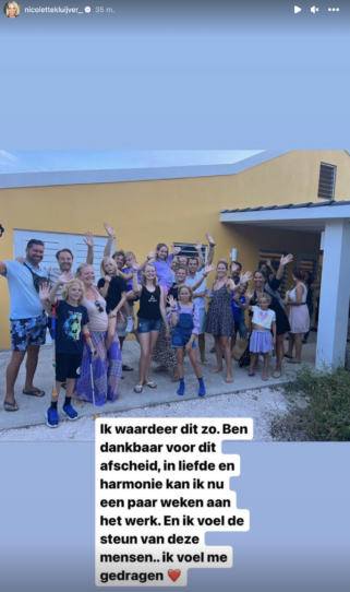 Nicolette woont samen met de kinderen en veel andere kennissen op Bonaire. Voor werk reist zij regelmatig op en neer naar Nederland, maar dit keer gaat zij voor langere tijd terug. Gisteren genoot Nicolette van haar laatste uurtjes en momenten in de zon. Zij heeft vervolgens een groot afscheid gehad en daar werd zij best emotioneel van. Een hele grote groep vrienden en kinderen stond voor haar klaar. Nicolette kreeg veel cadeautjes en knuffels en zij gaat iedereen ontzettend missen. ‘Ik waardeer dit zo. Ben dankbaar voor dit afscheid. In liefde en harmonie kan ik nu een paar weken aan het werk. En ik voel de steun van deze mensen.. Ik voel me gedragen.’, schrijft Nicolette onder een foto, waarbij de grote groep vrienden staat te zwaaien. 7 weken zijn zo om en voordat Nicolette het weet, is zij weer terug op het zonnige eiland.