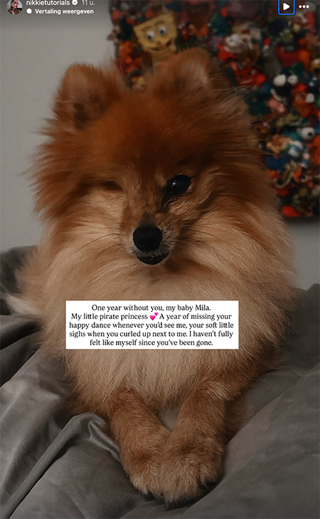 Nikkie had twee grote liefdes: haar man en haar hondje. Helaas is haar hondje vorig jaar overleden en hier heeft Nikkie het nog steeds heel moeilijk mee. Op Instagram staat zij stil bij dit grote verlies. Bij een prachtige foto schrijft zij: